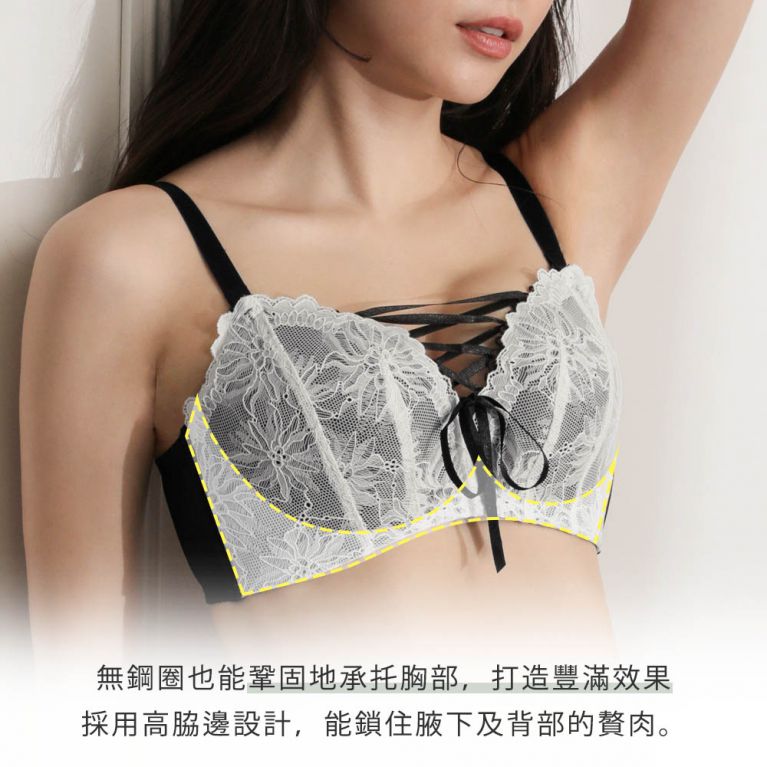 無鋼圈超盛內衣(R)有下厚罩杯及高脇邊設計,就算沒有鋼圈也能實現擁有驚人爆乳豐胸的心願!本款的緞帶設計,只要輕輕一拉就可達到胸部集中的效果。U字美背設計及高脇邊加高的壓條幫助集中鎖住多餘的贅肉,修飾側邊線條。緞帶還可拆下的二種設計,可按心情選擇變化。