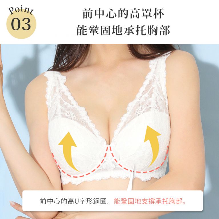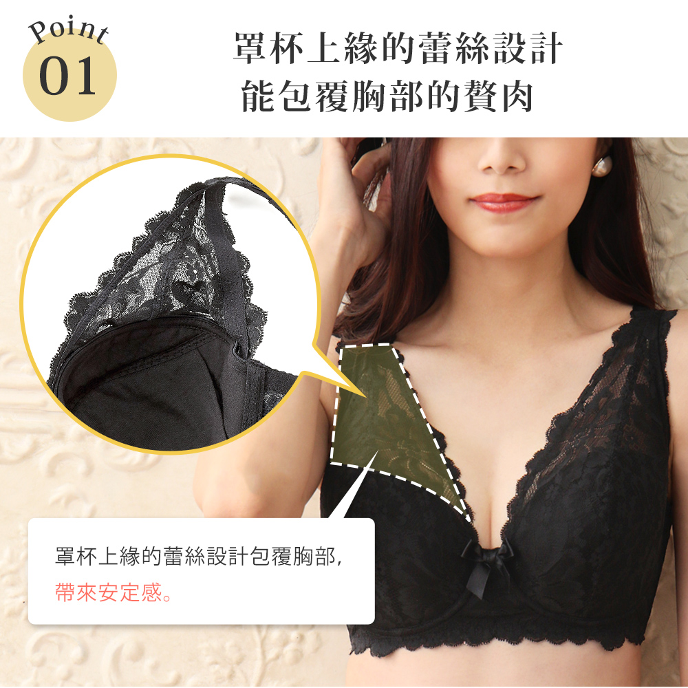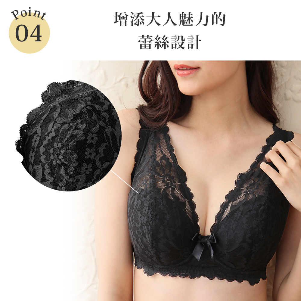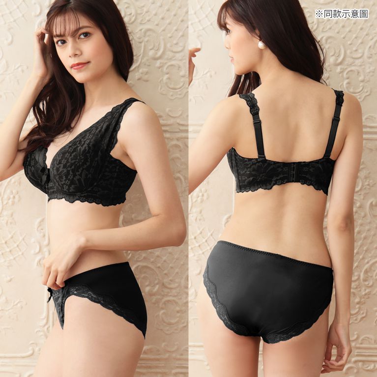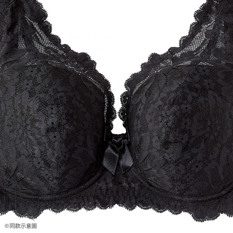 全罩杯×高脇邊帶來全面包覆的安心感。美麗精緻花卉蕾絲內衣。高脇邊設計&脇邊壓條幫助集中鎖住背部及腋下贅肉,打造俐落線條。高中心點的U字罩杯設計給予胸部更穩定的支撐!提高彈性蕾絲包覆的範圍,不僅能完整包覆胸部,更能修飾副乳。蝴蝶結點綴更添一絲可愛氣息。
