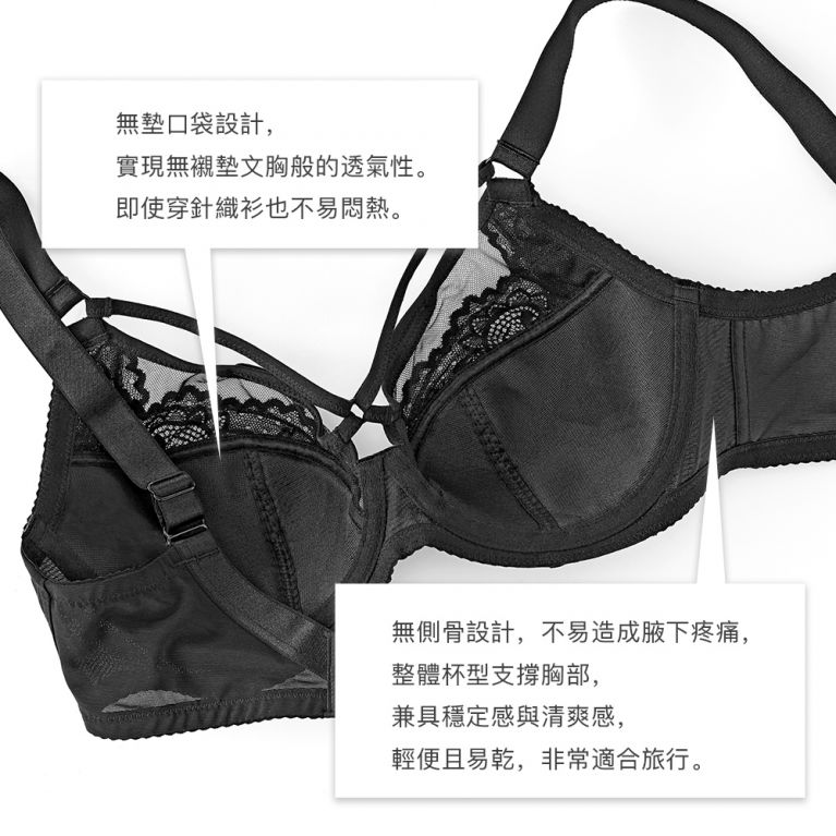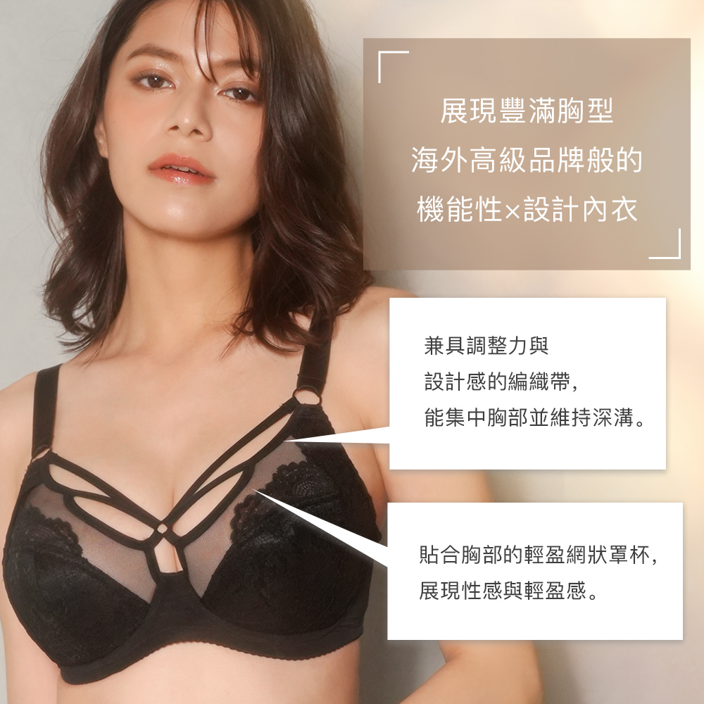 如同舶來品般的高級感與超強功能×設計讓大胸部也能美麗自信的FGH內衣單品。彷彿蝴蝶在胸前展翅的細繩設計,兼具美觀與調整效果,集中胸部打造立體深溝。服貼肌膚的縷空網布罩杯展現極致性感魅力。取消襯墊口袋,達到無襯墊內衣般的透氣感。搭配針織衫也不會感到悶熱不適。不使用側邊壓條,減輕腋下疼痛不適的產生,並透過罩杯給胸部全方位支撐,讓您安心又舒適。輕薄快乾適合旅行攜帶。