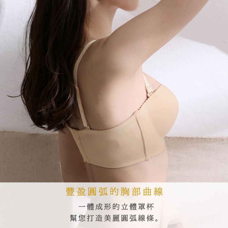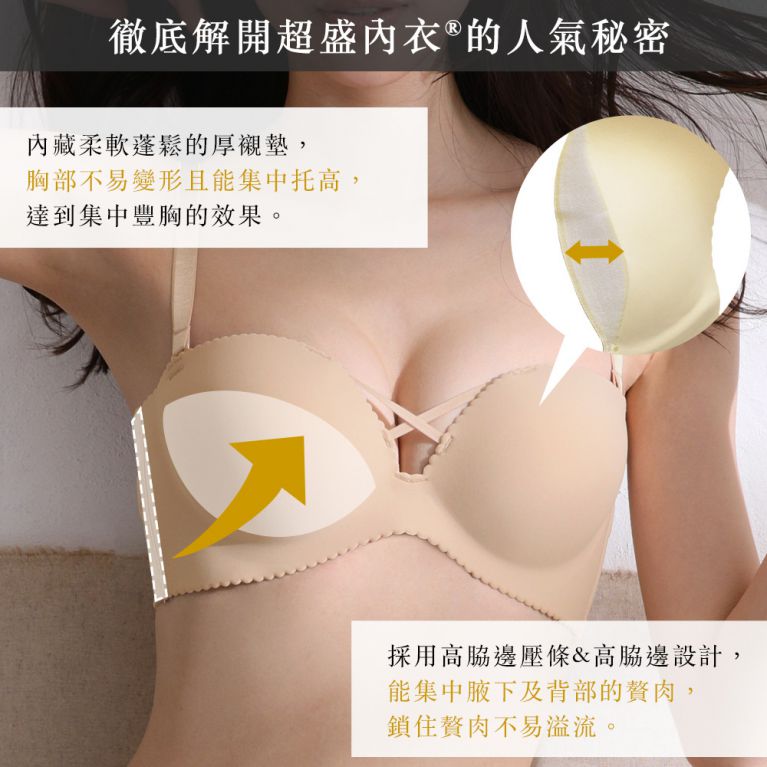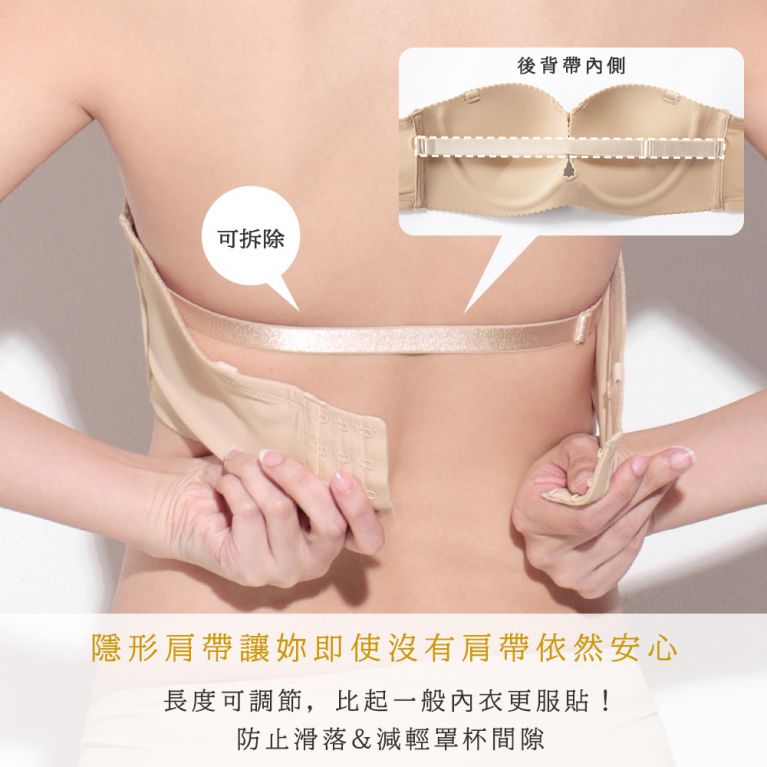 1/2罩杯款超盛內衣(R)新推出無肩帶款式!透過隱藏在背帶下的輔助背帶調節,能減少罩杯間隙產生及內衣滑落風險!柔軟的立體罩杯托高胸部,展現驚人爆乳效果!1/2罩杯設計讓你搭配低胸服飾也不用擔心會走光,還能保持美麗胸形曲線。再加上高脇邊壓條鎖住多餘贅肉,使腋下線條俐落清爽。寬版3排背扣帶給妳穩定安心感,維持胸部立體不溢流。夏季時尚搭配不可或缺的1/2罩杯內衣,愛時尚的女孩一定要擁有一件!