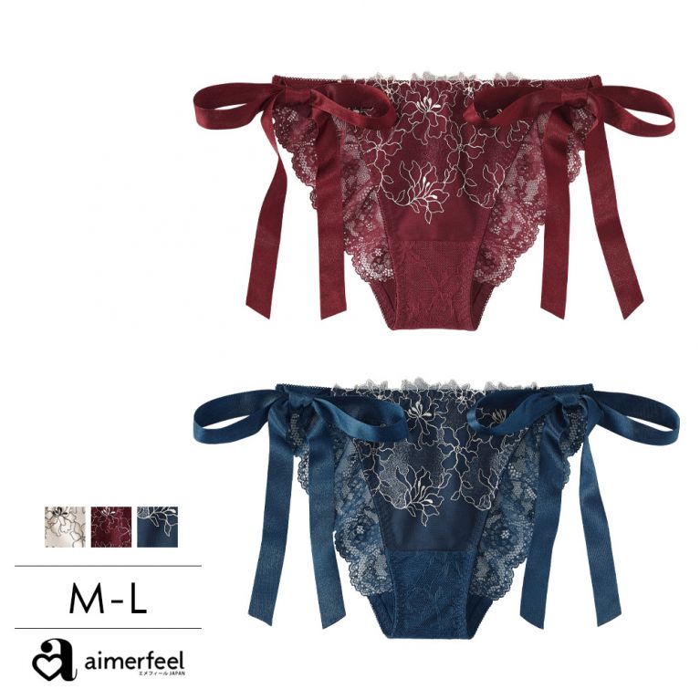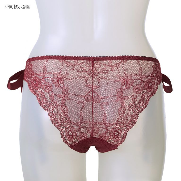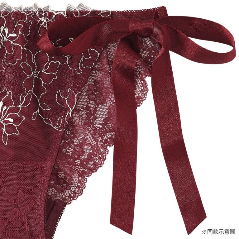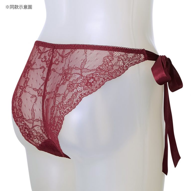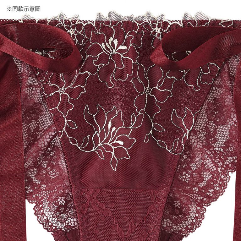 兩側緞帶與花卉刺繡蕾絲的可愛半包臀內褲,後側全蕾絲透視肌膚性感迷人。兩側緞帶為綁繩樣式,可依喜好調整鬆緊度。半包臀剪裁比一般三角褲減少臀部下半部的包覆,可修飾臀型使臀部看起來更渾圓,更沒有丁字褲的卡溝感,是擷取了丁字褲與三角褲優點的款式。