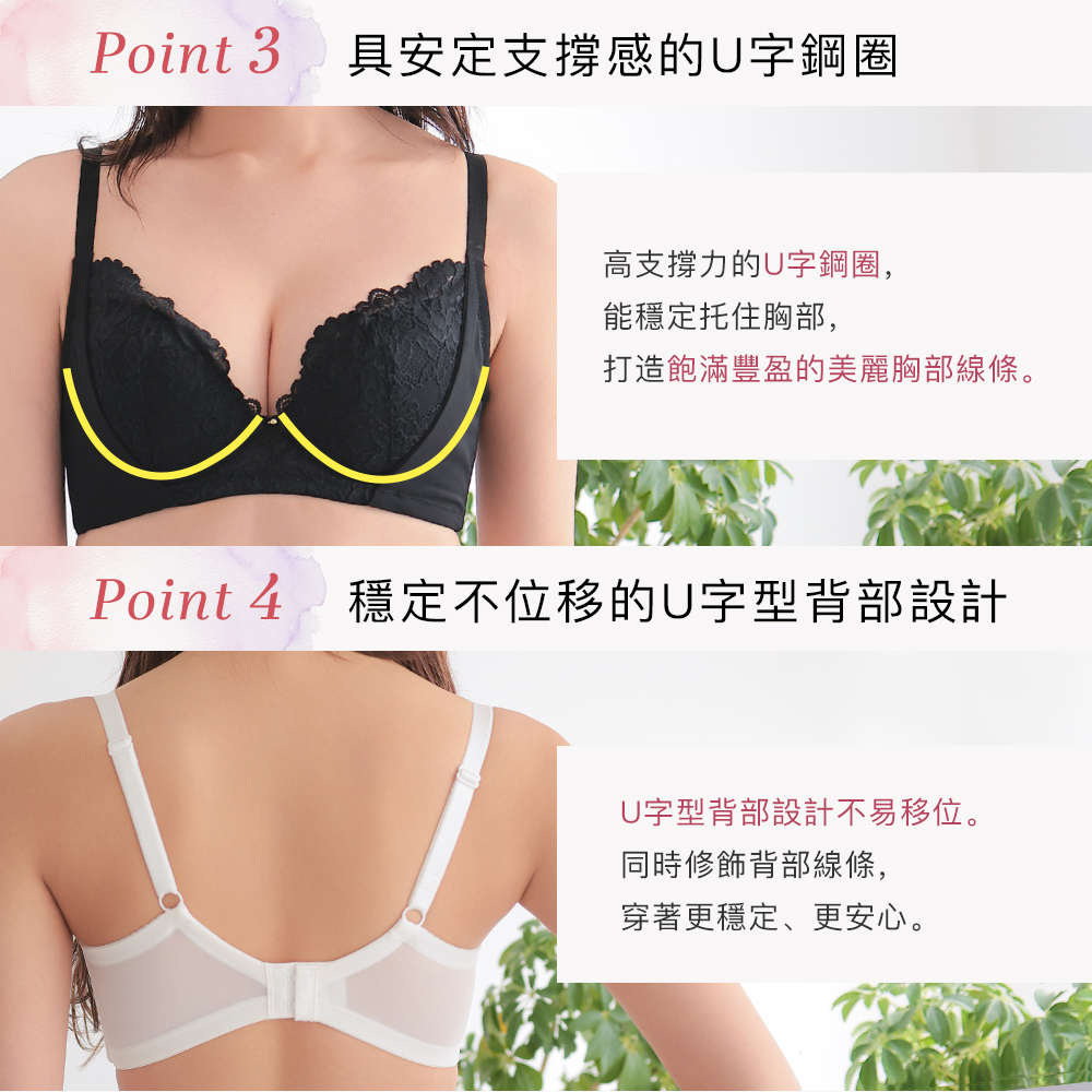 ・U字鋼圈由下方達到支撐效果,以維持胸部飽滿&渾圓曲線